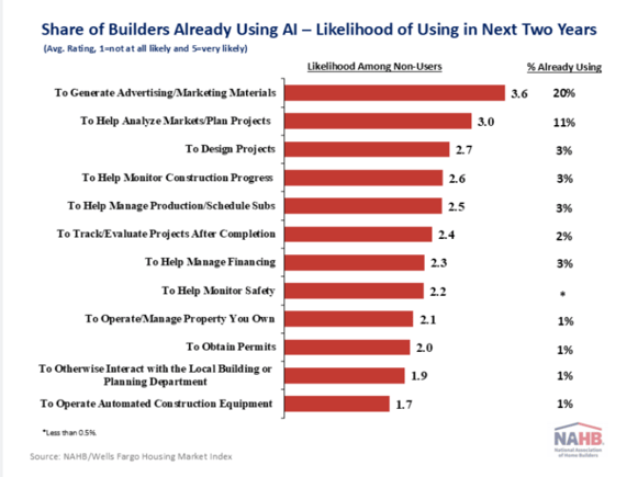 Industry data shows a clear pattern. Larger builders are experimenting with AI at higher rates, while smaller teams often cite lack of time, clarity, or internal resources as barriers.