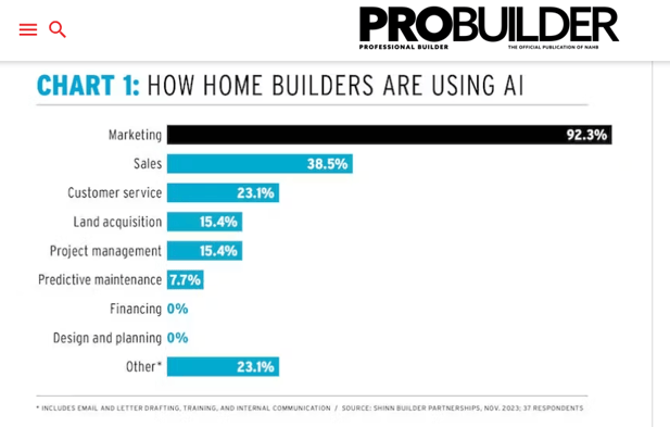 Marketing is the most common starting point for AI in homebuilding, and for good reason. According to ProBuilder, it is the area where builders see the fastest and most visible returns.