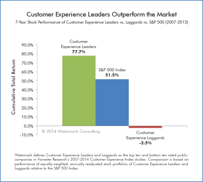Research firm Marketing Sherpa, published an article in April 2015 showing how the customer experience really affects business success, and shared the chart below (courtesy of Watermark Consulting). It compares the top ten and bottom ten rated public companies in Forrester’s Customer Experience Index Studies alongside the S&P 500 index.